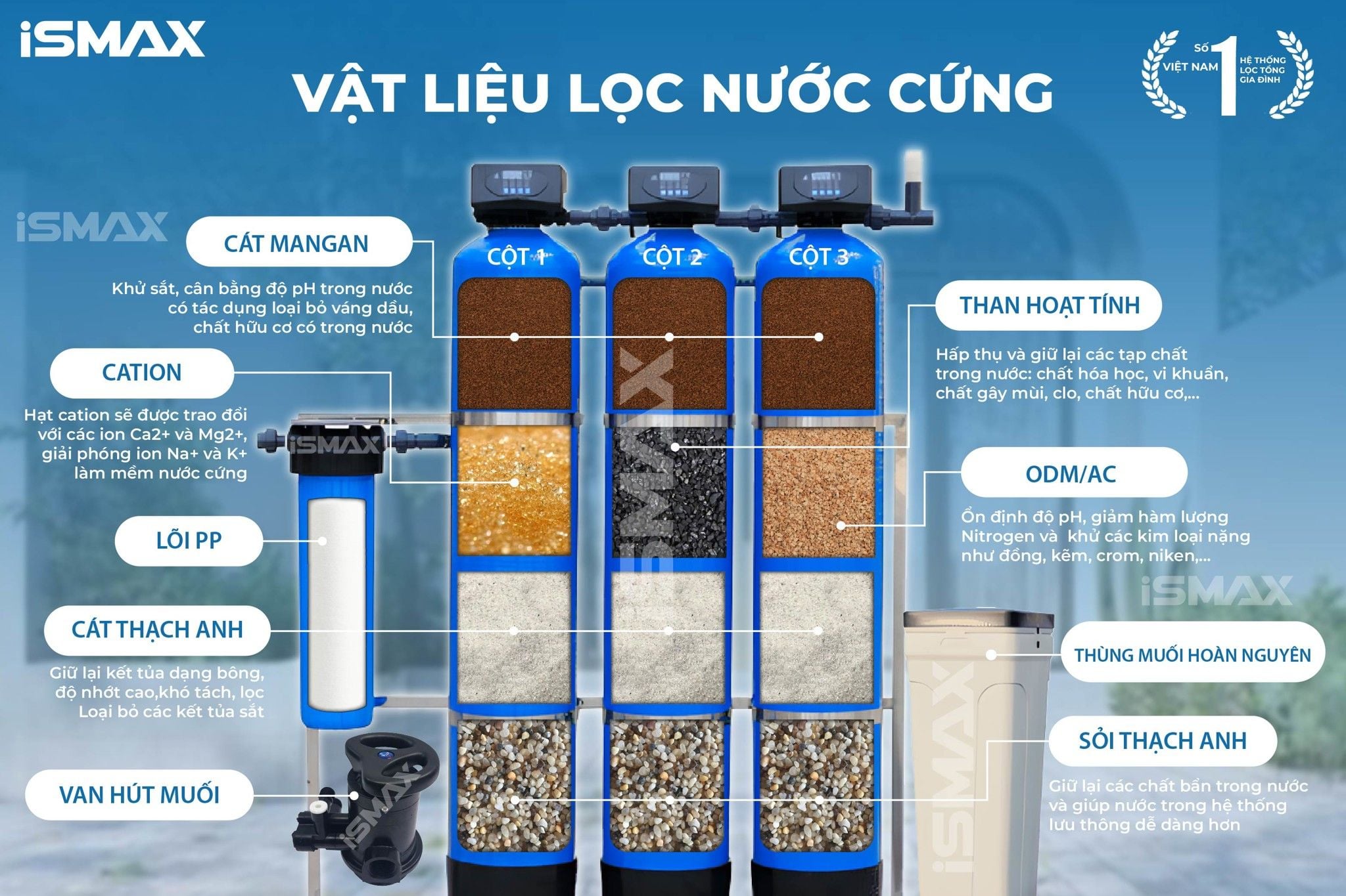 Hệ thống iSmax AquaSoft C3-1054S được chế tạo từ các vật liệu được nhập khẩu từ các quốc gia hàng đầu như Việt Nam, Nga, Malaysia, Ấn Độ và Úc. Sản phẩm đạt tiêu chuẩn chất lượng cao nhờ vào quy trình chọn lọc kỹ lưỡng, sử dụng vật liệu tự nhiên, đảm bảo an toàn và hiệu quả lọc tối ưu, không cần phụ thuộc vào hóa chất. Điều này giúp duy trì chất lượng lọc ổn định và bảo vệ sức khỏe người dùng một cách toàn diện.
