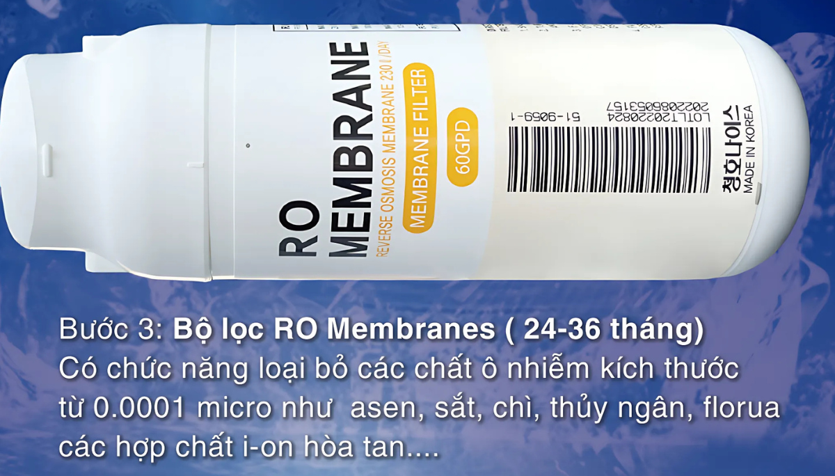 Tiếp nối quy trình là màng lọc ATCR RO Membranes. Được trang bị màng lọc RO chất lượng cao, sản xuất tại Mỹ theo công nghệ tiên tiến, lõi lọc này sở hữu khả năng lọc sạch đến 99.99% các chất ô nhiễm có kích thước siêu nhỏ từ 0.0001 micron trở lên. Nhờ đó, các kim loại nặng như đồng, sắt, nhôm, asen, mangan, nitrit, cùng với vi khuẩn, virus, chất phóng xạ, tảo lục và các ion florua – những tác nhân gây hại tiềm ẩn – đều bị loại bỏ một cách triệt để.