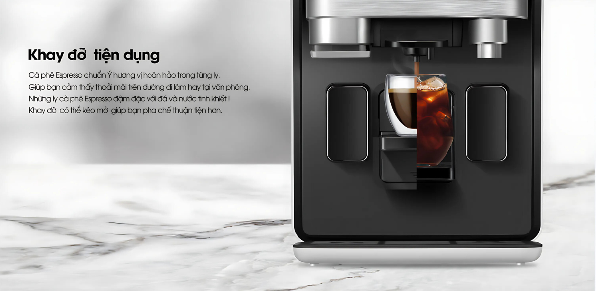 Nhập khẩu nguyên kiện từ Hàn Quốc Tích hợp 3 mức nhiệt Làm đá viên tinh khiết Pha cà phê viên nén Khử trùng điện phân Cơ chế tự sục rửa làm sạch ACS Tuần hoàn nước tự nhiên 24/7 Cảm biến mực nước quang học Kích thước nhỏ gọn Khay đỡ linh hoạt Khóa nước nóng Cảnh báo sử dụng Vòi nước điện tử Lấy nước rãnh tay