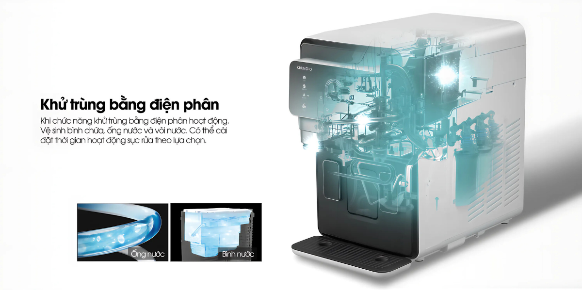Để tăng cường khả năng bảo vệ nguồn nước, máy lọc nước pha cà phê ChungHo ESPRE CAFFÉ tích hợp công nghệ khử trùng bằng điện phân tiên tiến. Đây là một phương pháp diệt khuẩn cực kỳ hiệu quả và an toàn, không sử dụng bất kỳ loại hóa chất độc hại nào.