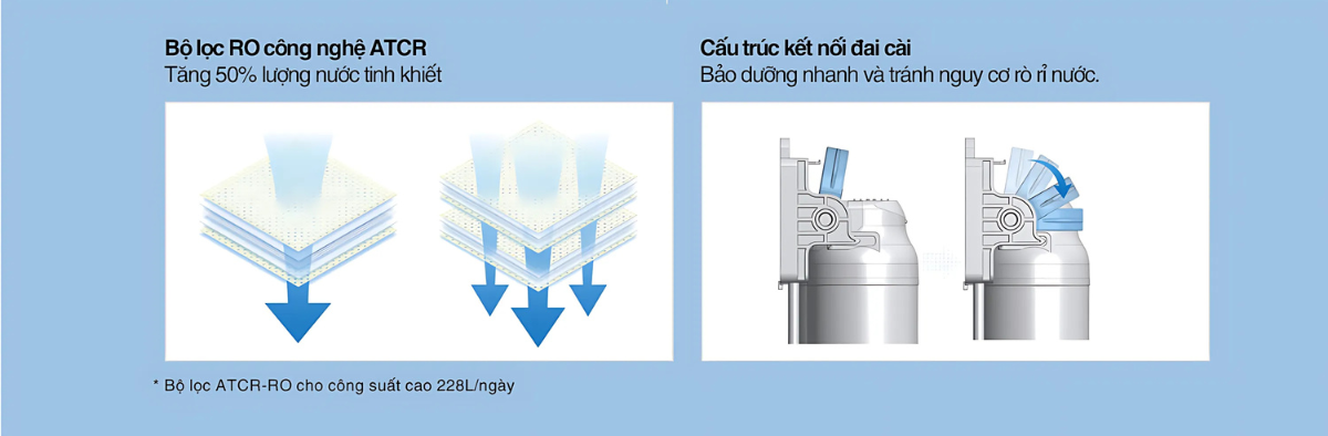 Không chỉ sở hữu cấu trúc bên trong ưu việt, hệ thống lọc ATCR thế hệ mới của máy còn được trang bị đai cài kết nối thông minh, giúp việc tháo lắp, thay thế và bảo trì trở nên vô cùng đơn giản và nhanh chóng. Nhờ đó, người dùng tiết kiệm tối đa thời gian và công sức, đồng thời giảm thiểu nguy cơ rò rỉ nước trong suốt quá trình sử dụng và bảo dưỡng, mang lại sự an tâm tuyệt đối cho mọi gia đình.
