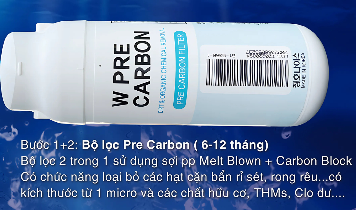Lõi lọc Pre Carbon có tuổi thọ từ 6 đến 12 tháng sử dụng, tùy thuộc vào nguồn nước đầu vào và tần suất sử dụng của gia đình.